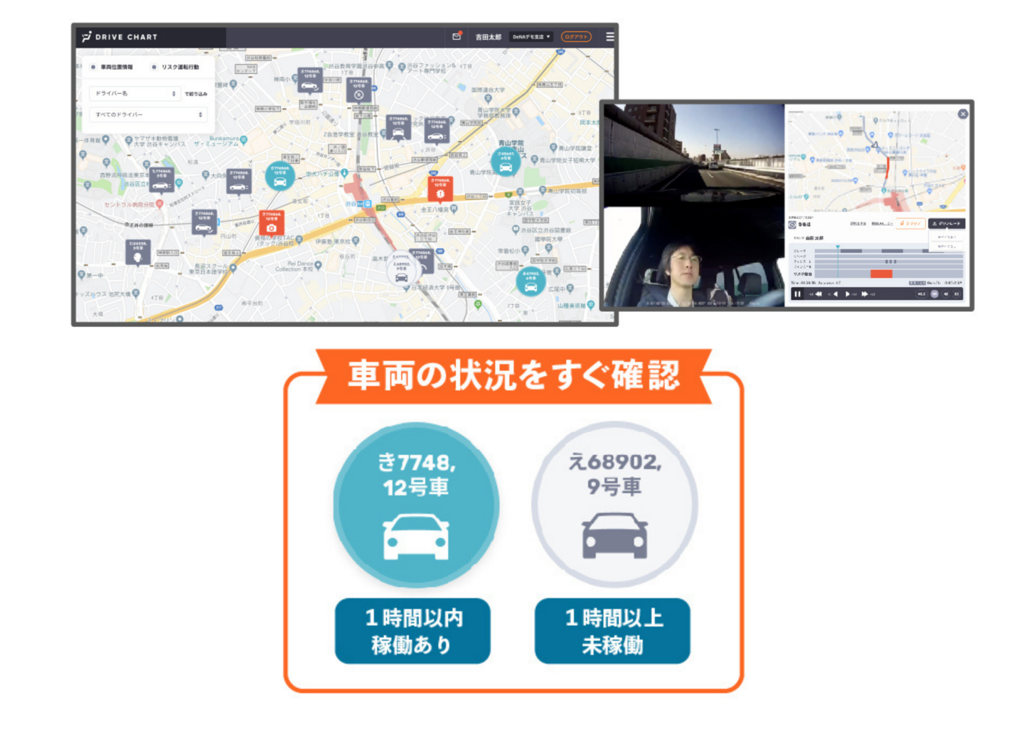 機能概要 リアルタイムで車両の現在位置をドライバー単位で絞り込んで確認できます。 解決できる課題・利用シーン 各車両の現在位置をすぐに把握したい個々のドライバーへ連絡することなく車両の位置情報を把握することができます。 ページトップへ 機能一覧 遠隔動画取得 走行軌跡表示 急後退の検知 リスク運転検出基準の変更 ライブマップ(リスク運転多発箇所) ライブマップ(車両位置情報) ヒヤリハット通知メール 週次サマリーメール 日報・月報自動作成 ドライバー顔認証 プライバシーモード アルコールチェック結果管理