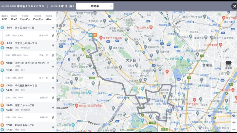 勤務時間内や社用車を利用している時間帯の行動が可視化でき、決められたルート通りに走行しているか、報告通りの訪問先に行っているかなどの把握が容易になります。これにより、社員の行動管理や配送ルートの計画が効率化できます。
