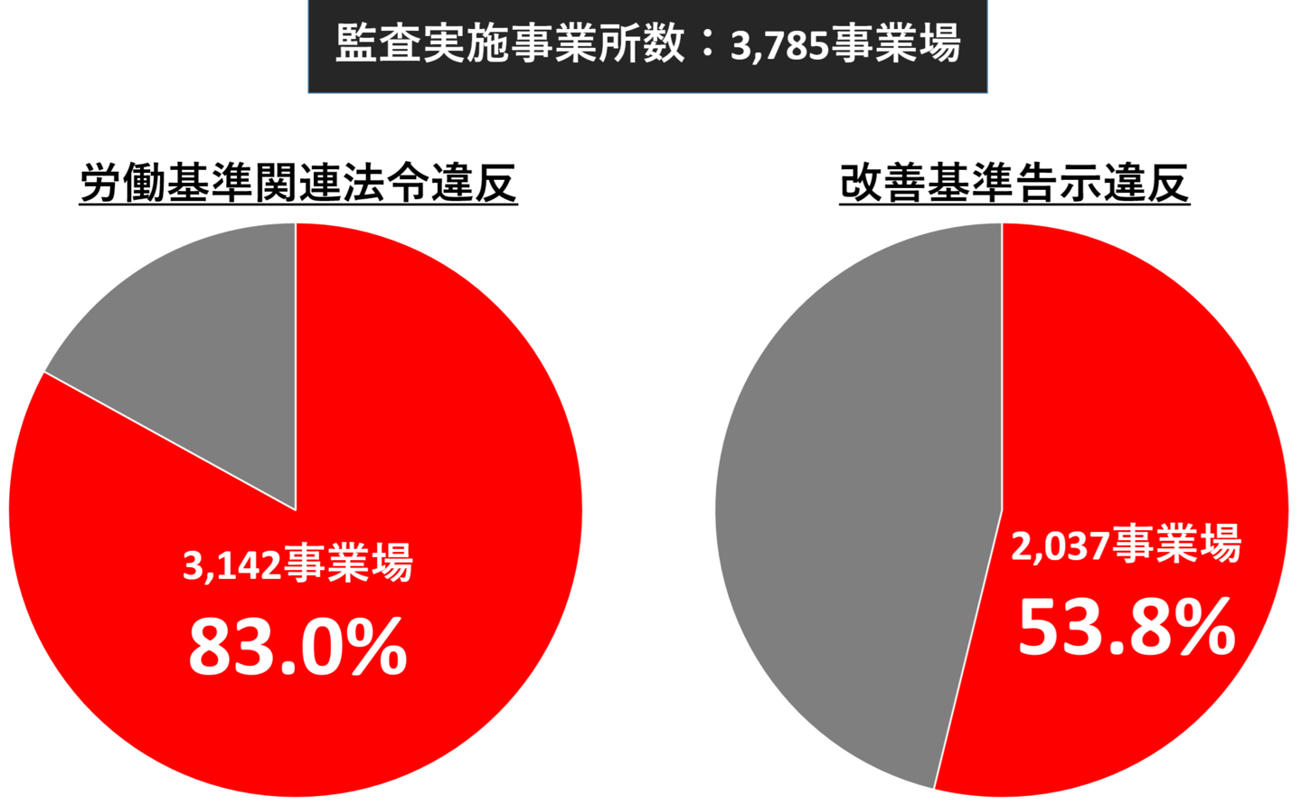 労働基準関連法令に違反した事業所は3,142事業場であり、実に83.0%の事業場で法令違反がある状況です。