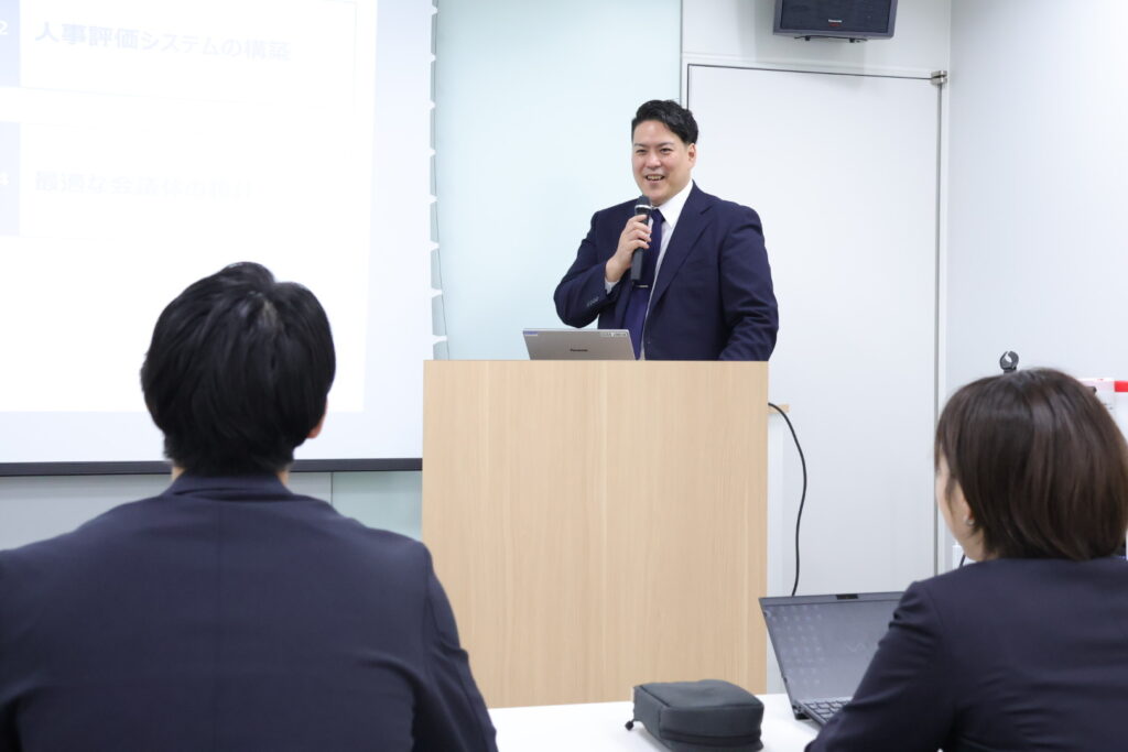 現在、私は主に3つの業務に携わっています。一つは、人事評価制度の構築・支援です。公平な評価と適切な給与支払いを目的とし、会社の経営方針と現場の思いを等級制度に反映させる仕組み作りを行っています。